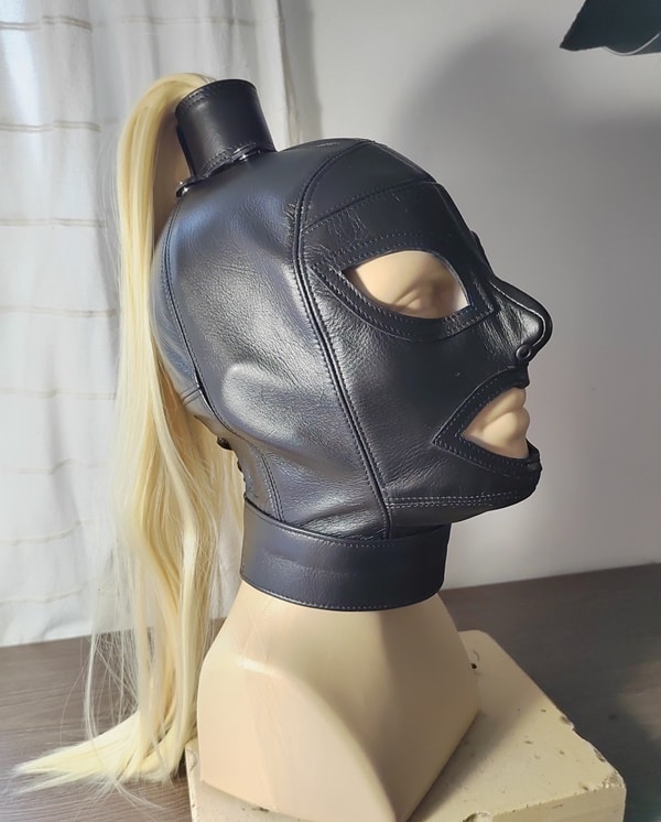 Ezt a különleges maszkot is vajpuha marhabőrből készítettem. Az arc kialakítása megegyezik a cicamaszkéval, de ezen fülek helyett egy patenttal rögzíthető, nyitható, belül tépőzáras copf található. Ennek köszönhetően a hajak cserélhetőek benne. A maszkhoz három különböző színű hajat adok (szőkét, feketét és sötét vöröset), de rendelhetsz hozzá más, tépőzárral rögzíthető hajakat is. Ha több vagy kevesebb copfot szeretnél hozzá, kérj árajánlatot.