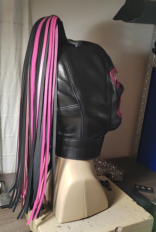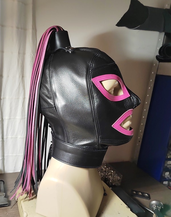 A száj- és szemkivágást keretező marhabőr közepesen vastag, de szintén kellően puha. Ebből a bőrből, és hasonló karakterű feketéből készítem a fejtetőn található copfot is, összesen 60 szálból, a hosszuk kb 50 cm. A copfot 4 db erős, fekete patent rögzíti a fejtetőhöz, így eltávolítható, aminek két előnye van: